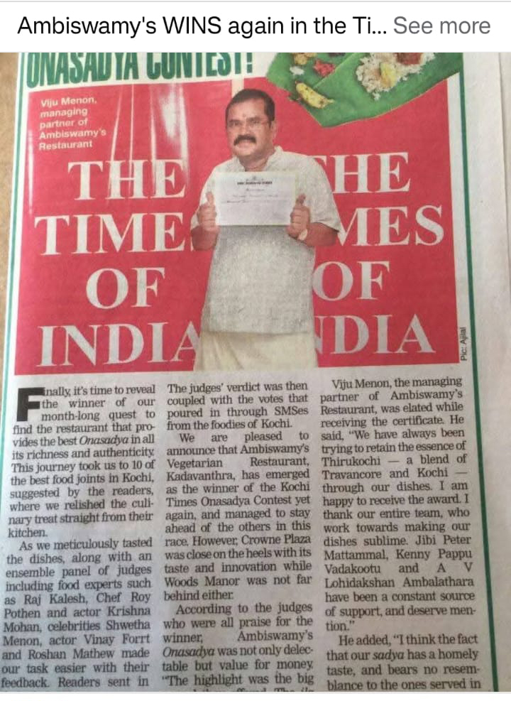 Ambiswamys fast food was established in Cochin. The overwhelming popularity of its brand and products have contributed in making it popular.